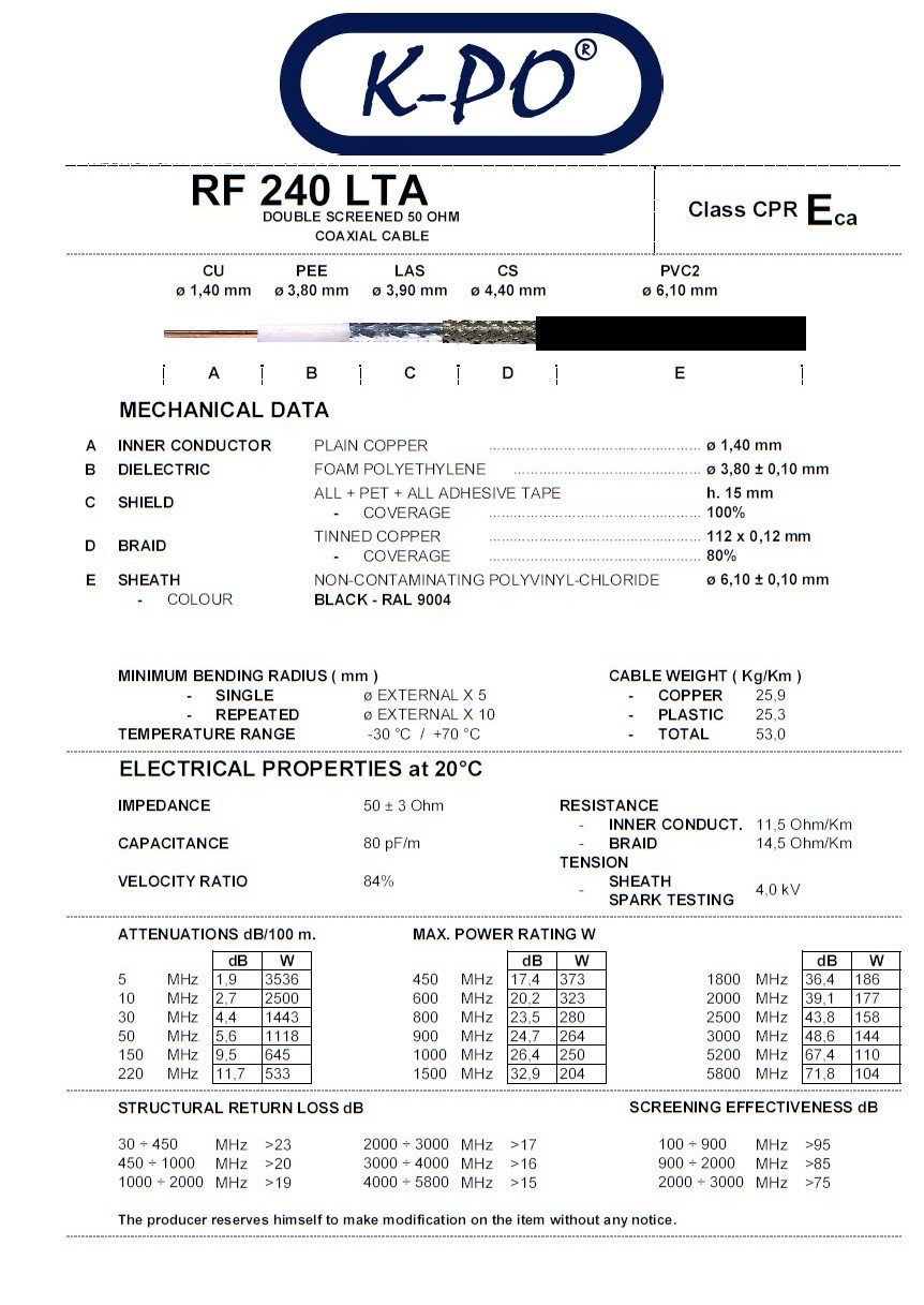 The K-PO HF 240 PVC (RF 240 LTA) is a military quality coax cable with CPR/ECA classification.