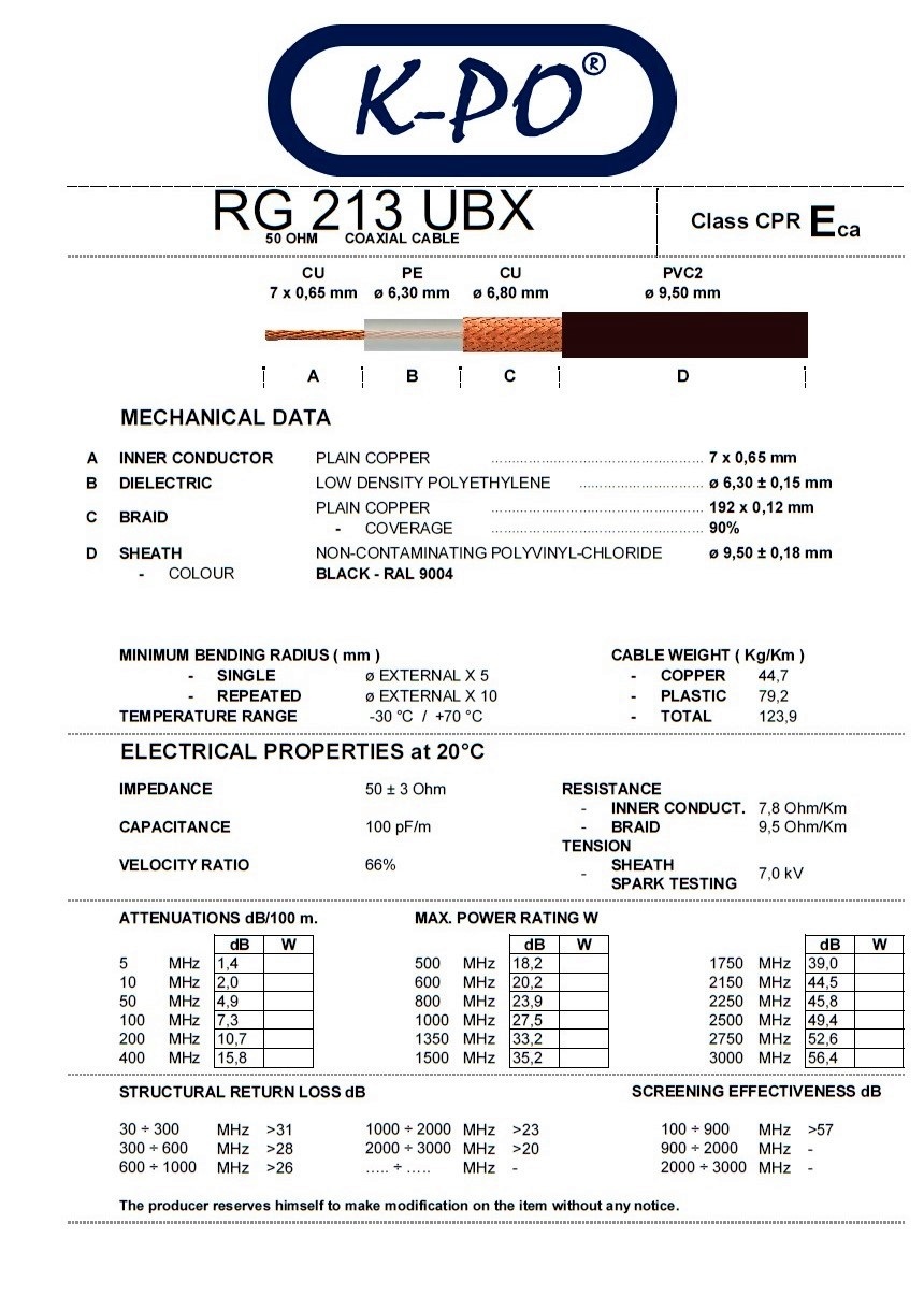 The K-PO RG 213 UBX is a high quality coax cable and has a CPR/ECA classification. For CB users that want a better quality cable then the standard RG 213 BX and for use with amateur radio.